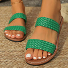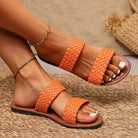 Crafted from soft, braided vegan leather and styled for sunny escapes, this easy slide-on brings comfort and color to every step—whether you’re beach-bound or brunch-ready.