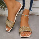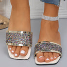 Crafted with a smooth slip-on design, comfy flat sole, and all-day dazzle made to move in these sandals. These glitter-accented slides add instant glow to casual looks—slip into shimmer with every step.