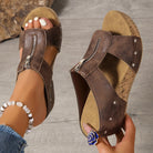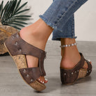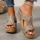The Liora Zip Wedge Sandals – 2025 blend vintage charm with modern-day comfort. Featuring a cork-style platform, metallic zipper accent, and rivet detailing, these sandals offer the perfect balance of bold design and cushioned support—made for women who want to stand tall in style.