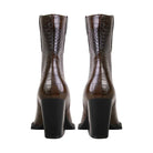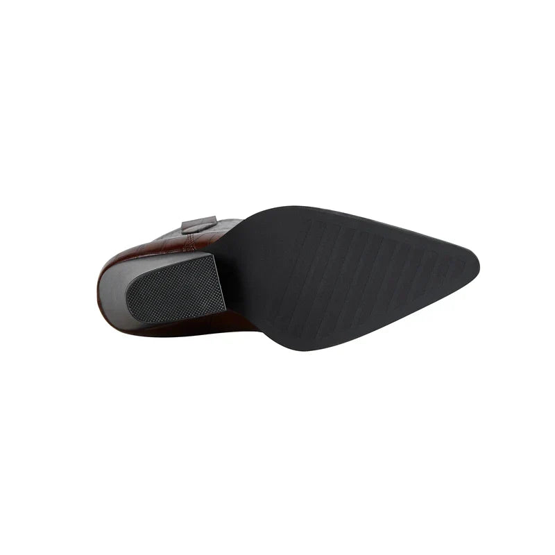 Crafted with a striking croc-embossed finish, these pointed-toe ankle boots bring western attitude with a modern edge. A mid-calf cut and angled block heel add height and structure, making them a versatile statement from day to night.
